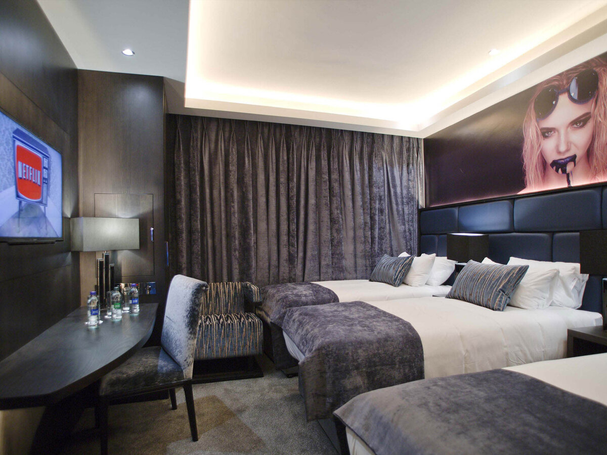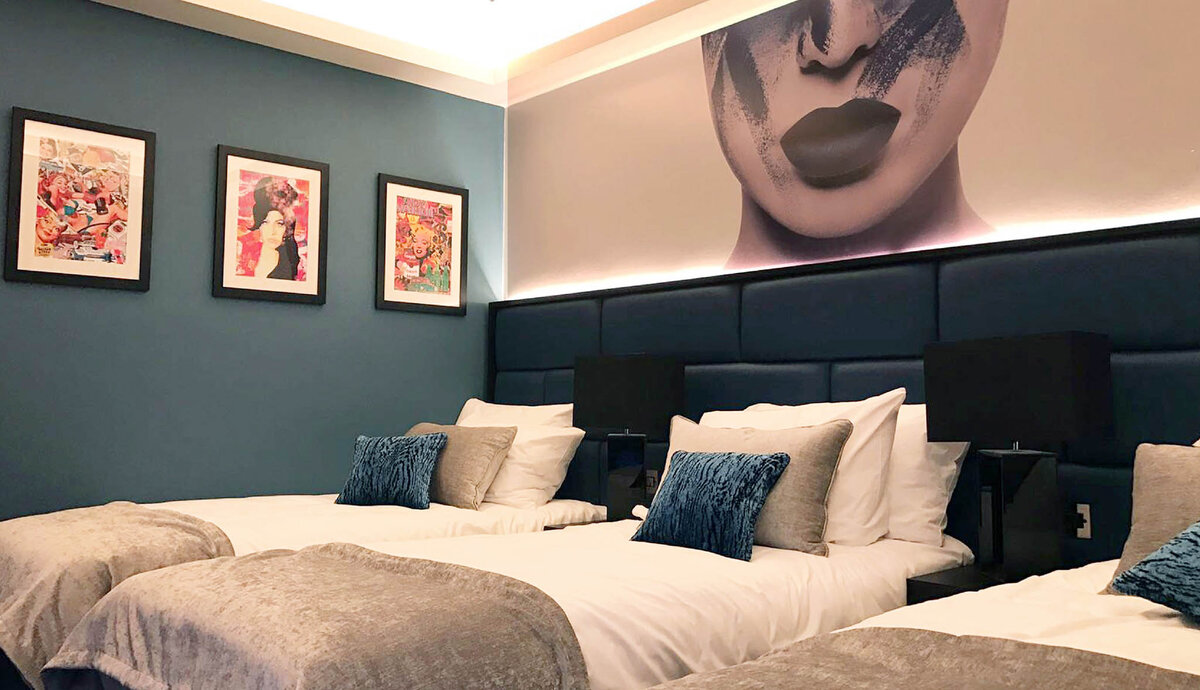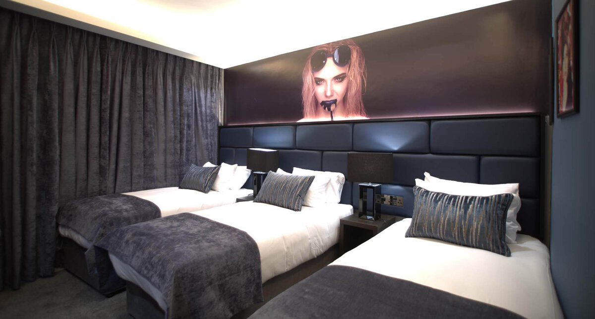 Link to Photo5, a room with two beds and a poster on the wall